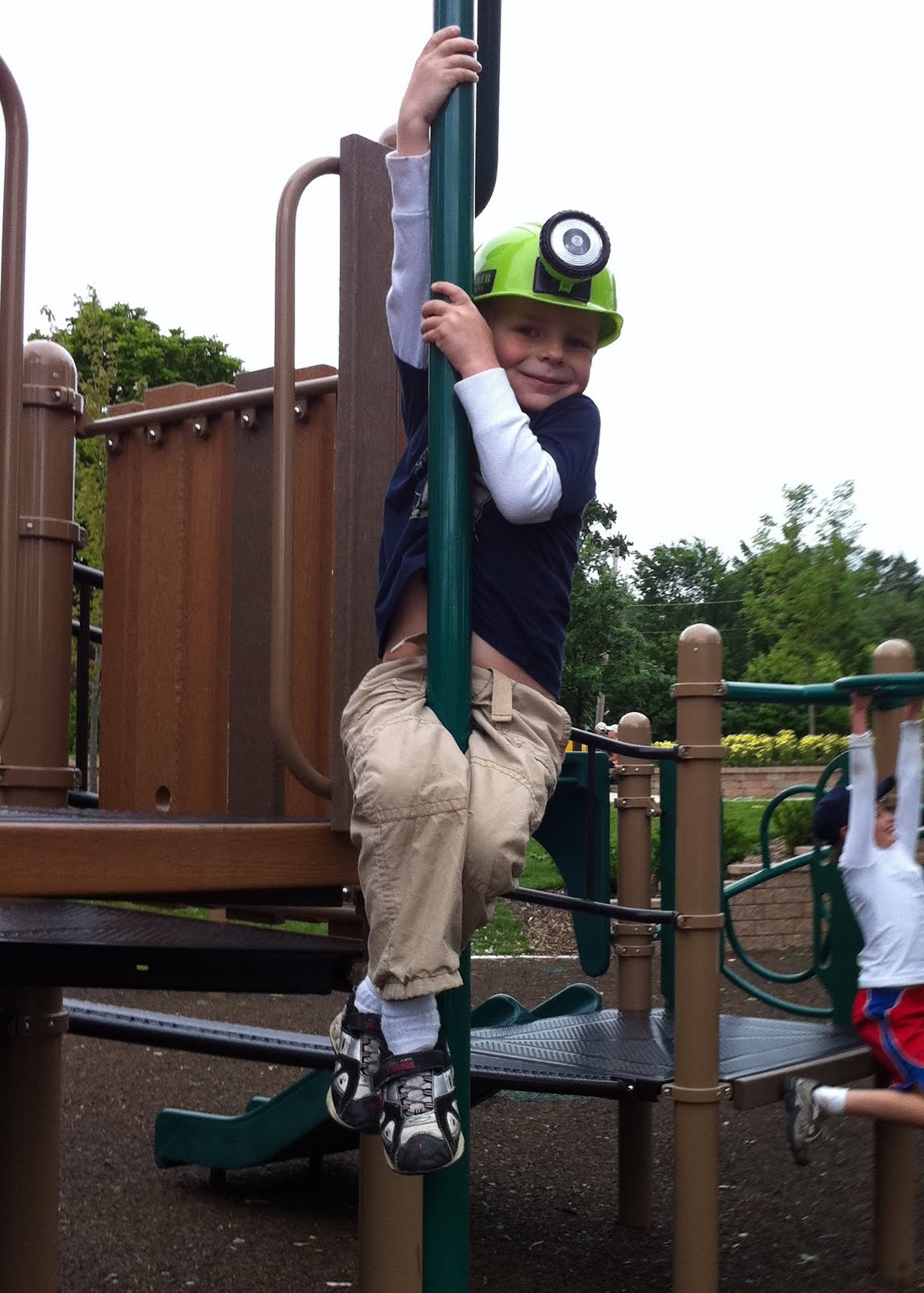 Evan was quite the pro at the fireman's pole. The hat that you see on his head has been a fixture there as of late. He got it in Tennessee, and he's very attached to it. He even sleeps with it at night.