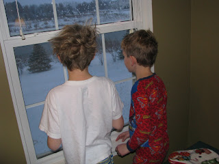 What a winter wonderland we woke up to this morning! And how fun that the kids' first day back at school after Thanksgiving break was a very snowy one! Right when the boys woke up this morning, they went running to the window, and were just so excited with all of the possibilities that a fresh snowfall brings. The house was all abuzz with getting out the snowpants, boots and other winter gear. Evan felt he had to take part as well, and so decided to try on everyone's boots. Caroline wanted to suit up right when she woke up, no matter that she wasn't going to school for an hour.